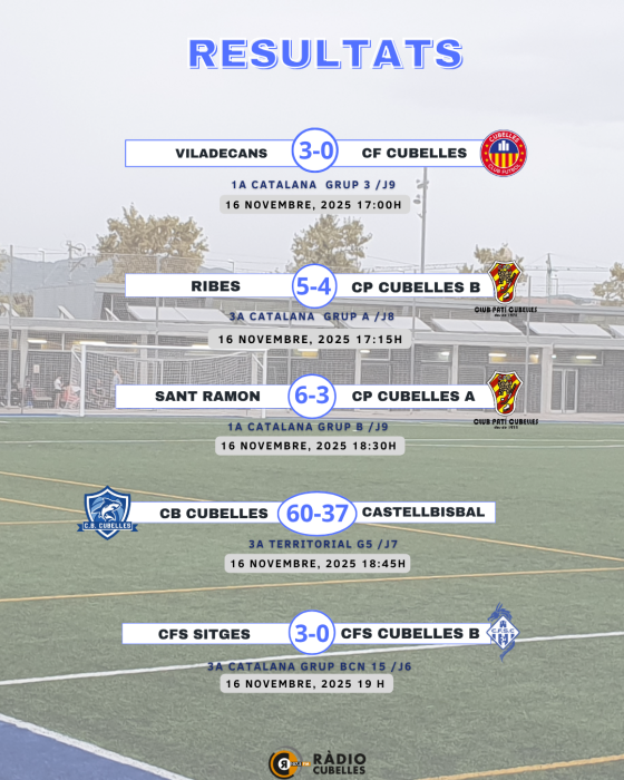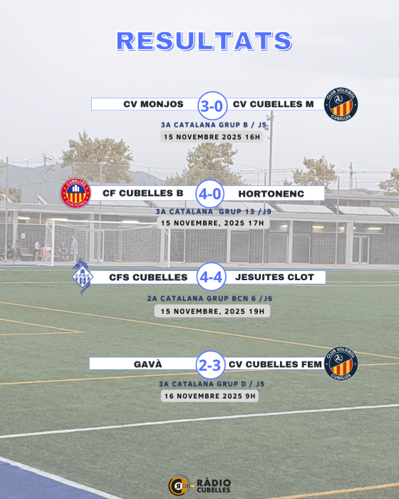 Els equips esportius de Cubelles van viure un cap de setmana carregat de competició entre el 15 i el 16 de novembre de 2025, amb participació en disciplines com el futbol, el futbol sala, el vòlei, el patinatge i el bàsquet. Les diferents seccions van obtenir resultats variats, que van combinar victòries destacades, empats molt treballats i derrotes ajustades.