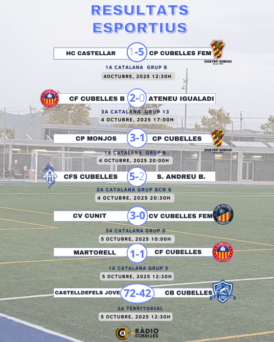 En futbol, el CF Cubelles B continua intractable: va superar l’Ateneu Igualadí per 2–0 (3a Catalana, grup 13) i es consolida com a líder després de tres jornades, amb ple de victòries. El primer equip va empatar 1–1 al camp del Martorell (1a Catalana, grup 3), sumant un punt valuós a domicili.