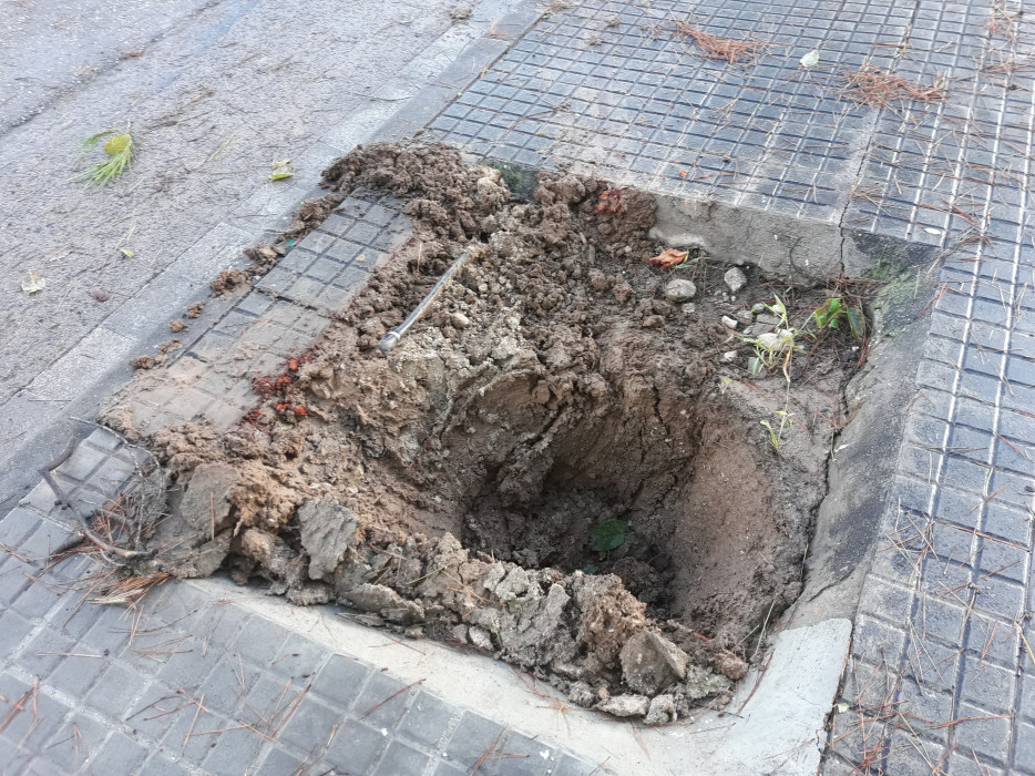 La matinada de diumenge a dilluns és quan la pluja ha estat més intensa i s'ha sumat a les ventades. Poc després de les dotze de la nit ja s'ha tallat el pont del Salze. Els voluntaris de protecció civil també han hagut de recol·locar tapes de claveguera que han saltat a l'avinguda de la riera i al carrer del Raval del torrent. Al carrer del General Moragues han caigut diversos arbres. Al carrer del Vallespir també ha caigut un arbre a la zona de la casa del polígon. A l'avinguda de la Mediterrània l'aigua ha mogut contenidors fins al mig del carrer fins que la Policia Local els ha tornat al seu lloc. A quarts de quatre de la matinada dos pins de grans dimensions han caigut al carrer de la Millera a tocar de la cantonada amb Darius Huguet (imatge). Un dels arbres s'ha emportat un fanal que també ha acabat a terra. A quarts de sis del matí, a la zona de Mas Trader, al carrer de Velàzquez, també han caigut diversos pins que han arrencat el cablejat elèctric i una torre de FECSA Endesa, cosa que impedia el pas de vehicles. Els bombers han esperat més d'una hora als tècnics de la companyia elèctrica que no han aparegut. Els bombers s'han retirat sense poder actuar al carrer de Velazquez. Aquest matí els tècnics d'Endesa encara no s'havien presentat.