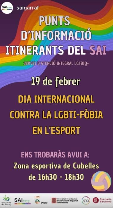 Durant l’últim any, el SAI Garraf ha impulsat diverses iniciatives a la comarca per combatre la LGBTIfòbia i les violències masclistes en l’àmbit esportiu. Entre les actuacions destacades hi ha la implementació de bústies LGBTI+ i de violències masclistes als equipaments esportius de Cubelles, amb la finalitat de facilitar la detecció i denúncia de situacions discriminatòries.
