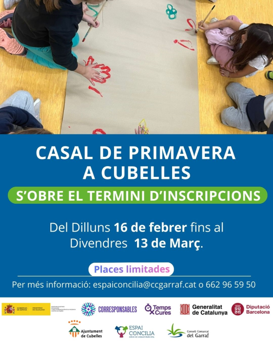 El servei “Espai Concilia, temps per cures i per tu”, creat l’abril de 2023, ofereix suport puntual en la cura d’infants per promoure la corresponsabilitat social, laboral i familiar. A Cubelles, el programa compta amb un equip de professionals de la integració i l’educació social que dinamitzen tallers, activitats d’animació sociocultural i espais de joc i lectura.